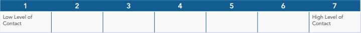 Use the scale to place your intergenerational program on a continuum with points that correspond to different levels of intergenerational engagement, ranging from initiatives that provide no direct contact between age groups (point #1 on the continuum) to those that promote intensive contact and ongoing opportunities for connections (point #7 on the