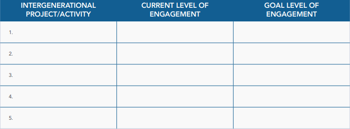 Use this chart to rate your current level of intergenerational engagement and your goal for intergenerational engagement, on a scale of 1-7, for each of your intergenerational programs. You may find the two numbers are the same. Add additional rows to the chart to list more activities.